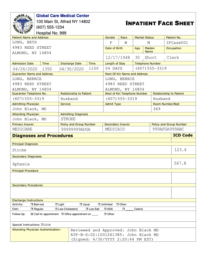 - The face sheet should include client demographics, insurance information, and diagnosis information.